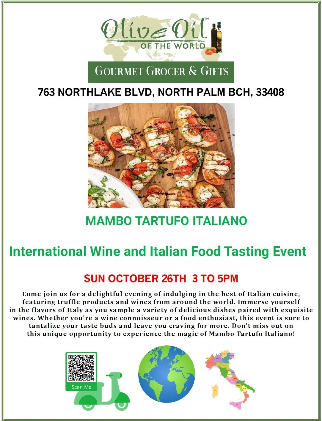 Mambo Tartufo Italian Food & Int'l Wine Tasting Sunday, October 26, 2025 3:00 PM 5:00 PM 15:00 17:00 Olive Oil of the World 763 Northlake Boulevard North Palm Beach, FL, 33408 United States (map) Google Calendar ICS Click on our flyer for tickets