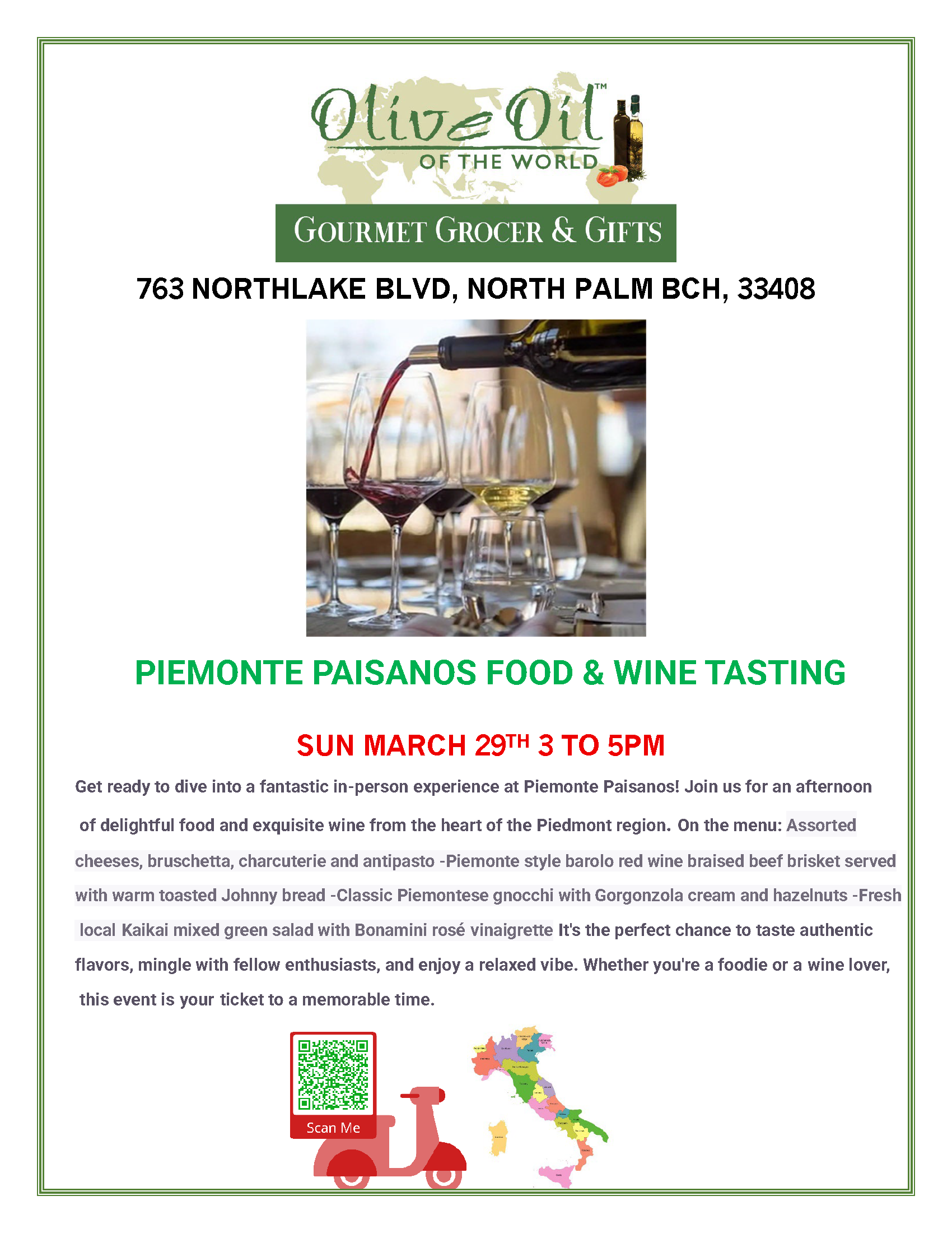ON THE MENU : -Assorted cheeses, bruschetta, charcuterie and antipasto -Piemonte style barolo red wine braised beef brisket served with warm toasted Johnny bread -Classic Piemontese gnocchi with Gorgonzola cream and hazelnut -Fresh local Kaikai mixed green salad with Bonamini rosé vinaigrette SERVED WITH TASTINGS OF 2 RED & 2 WHITE WINES